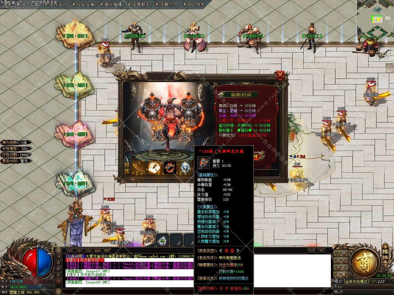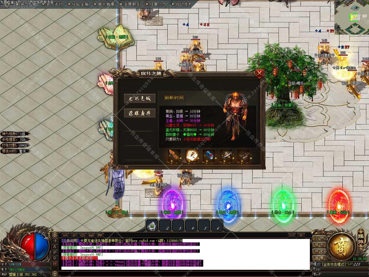 九、福利地图,怪永远刷不完,无限怪本地图打元宝材料首选,每天0.00刷新全套神器怪物爆神器装备,福利地图每2小时刷新★荣耀福利★BOSS,必爆20w元宝,还有大量红包等。