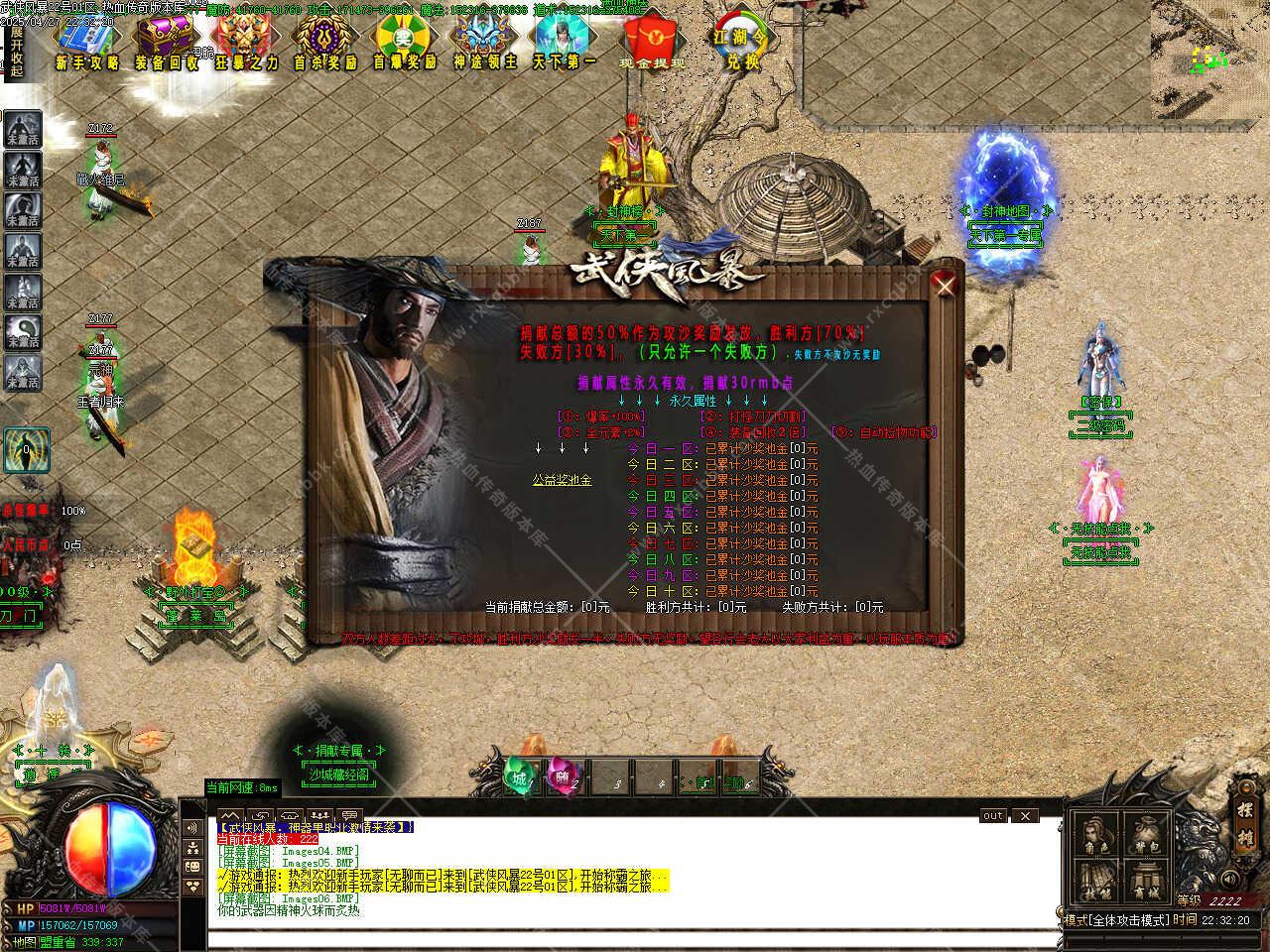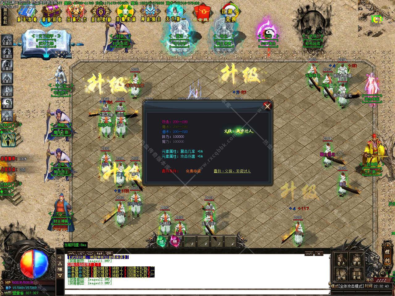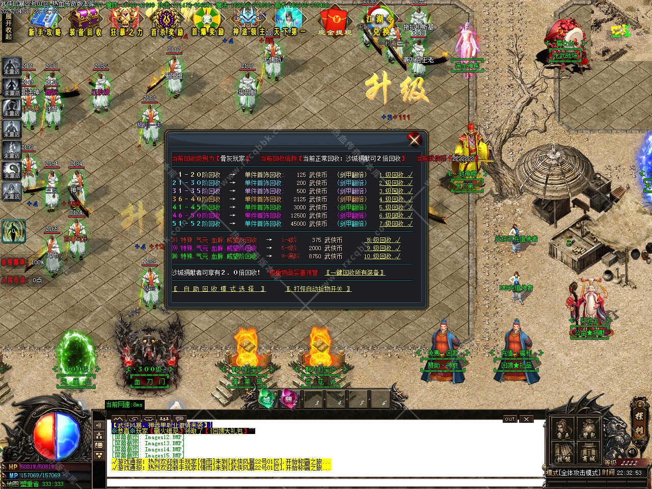 版本介绍:在主城地图按部就班的打点装备,所有地图都可以边打怪边泡级,多的装备可以回收武侠币,土城上面可以升级称号、时装、转生、武学来提升自身实力,泡到400级升到10转去土城左上角下二大陆继续提升实力。