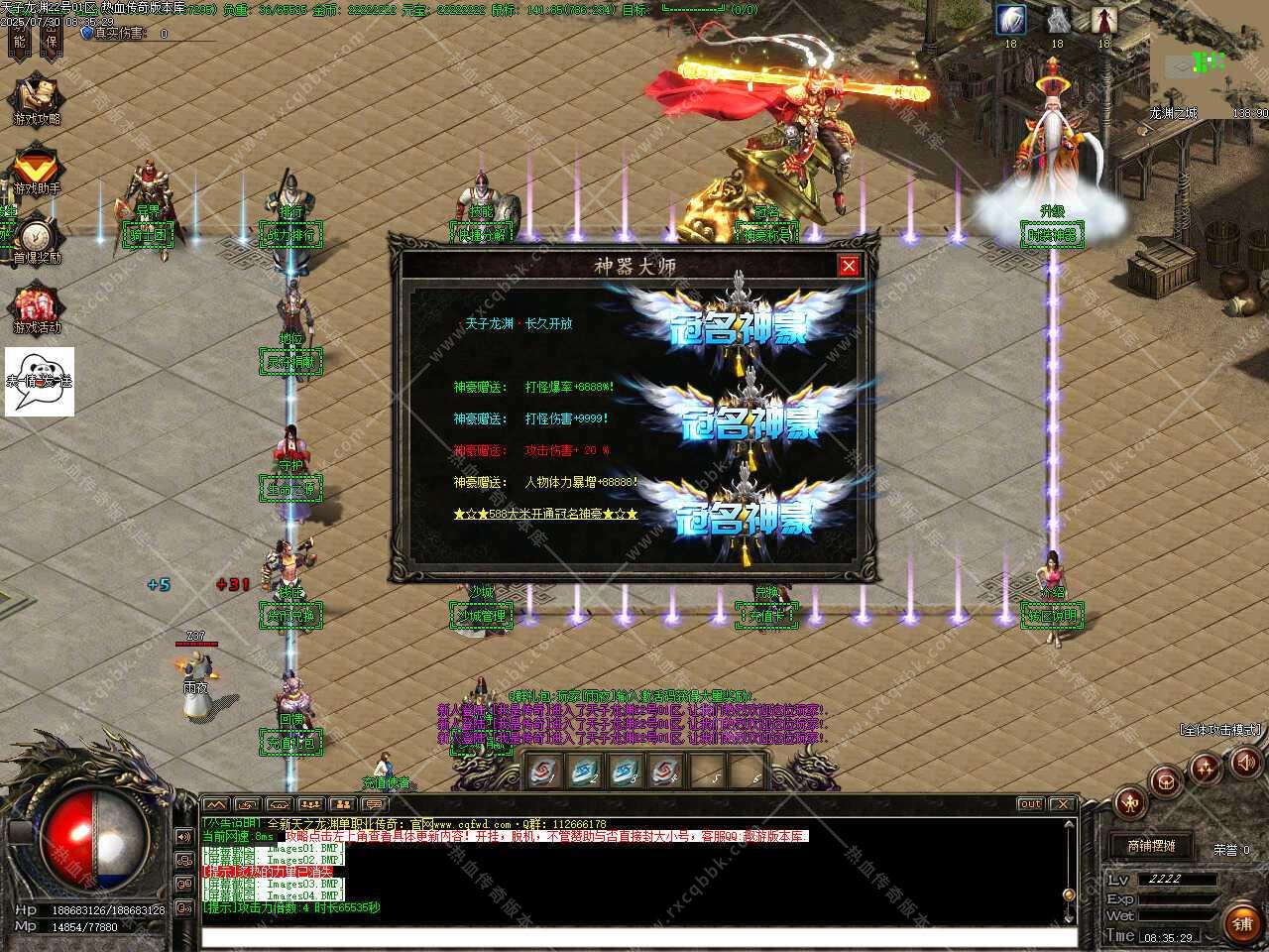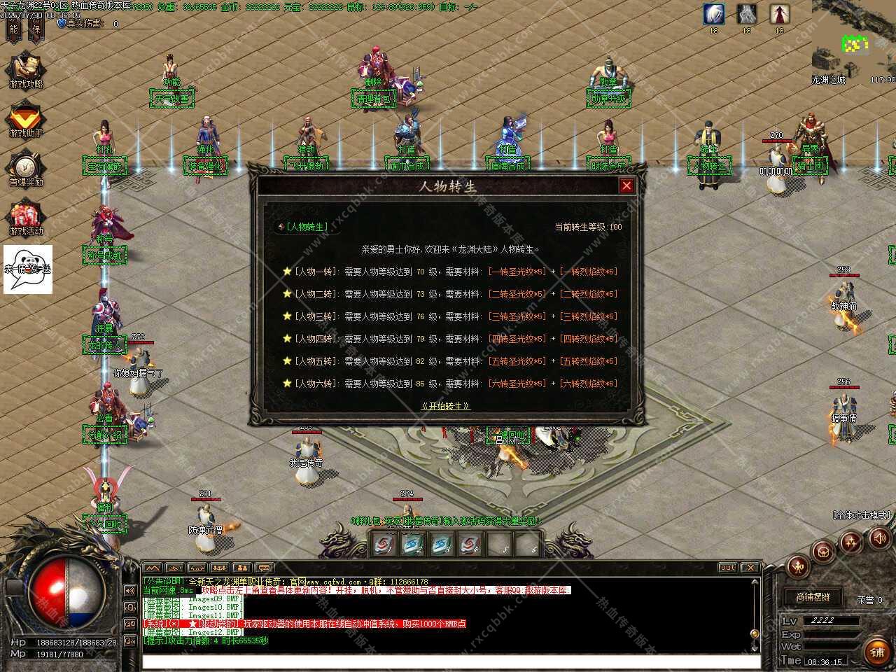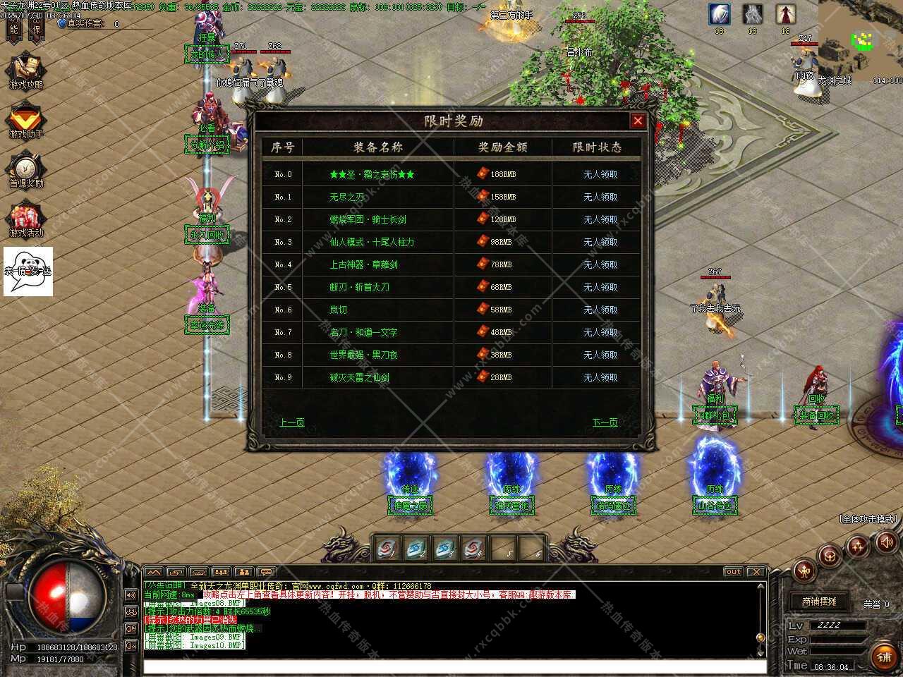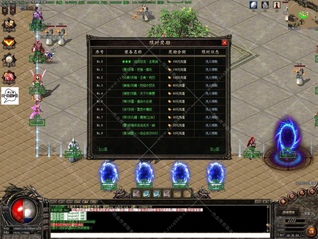 一、此传奇服务端版本补丁大小11.36GB,无二次加密补丁,建议用16周年或17周年测试,Q群兑换码是666888,版本使用了ESP和神盾插件,根据自己的需求进行选择。版本带有假人功能,清档自动上线。