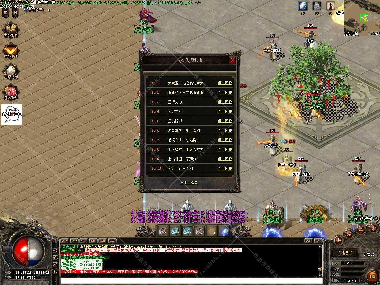 六、此版本更新增加时装武器装备,上线可小安全区免费领取,增加冠名大哥称号,属性超强,游戏自行查看,土城增加后期装备永久回收,增加自动回收开关,助手处开启。
