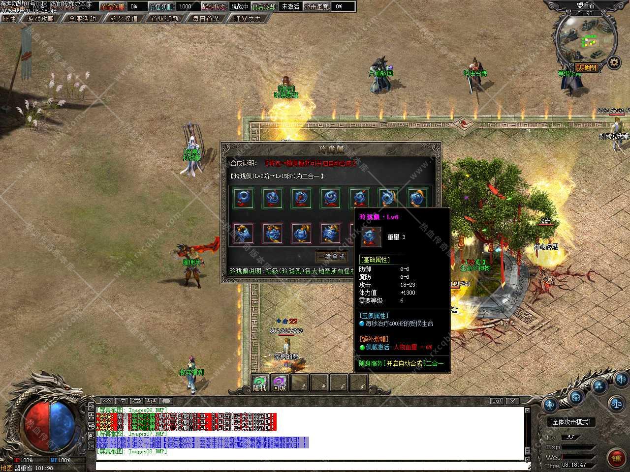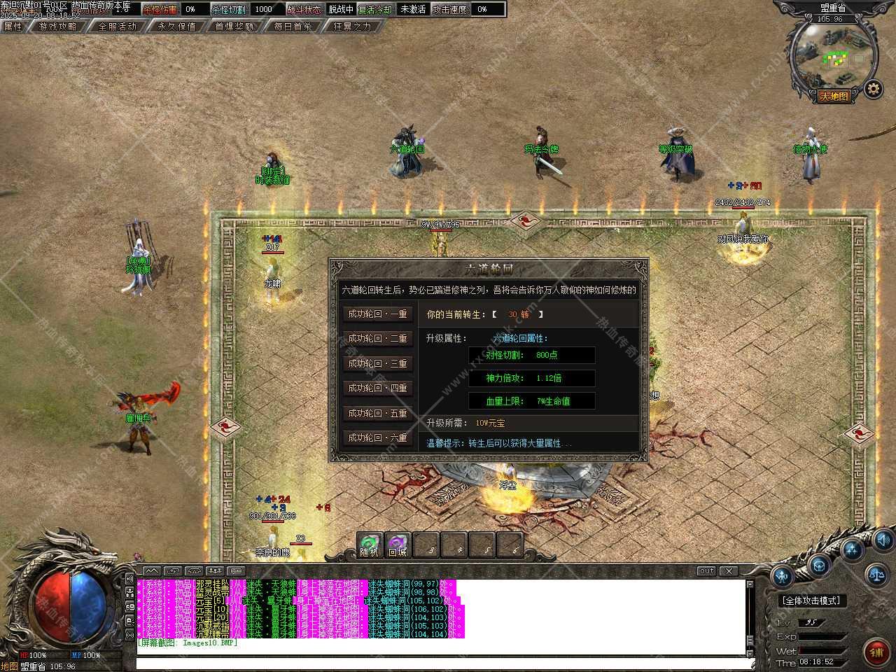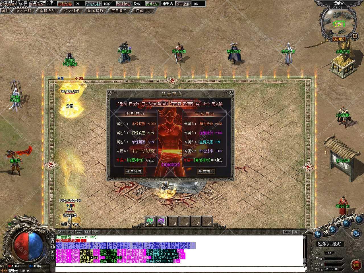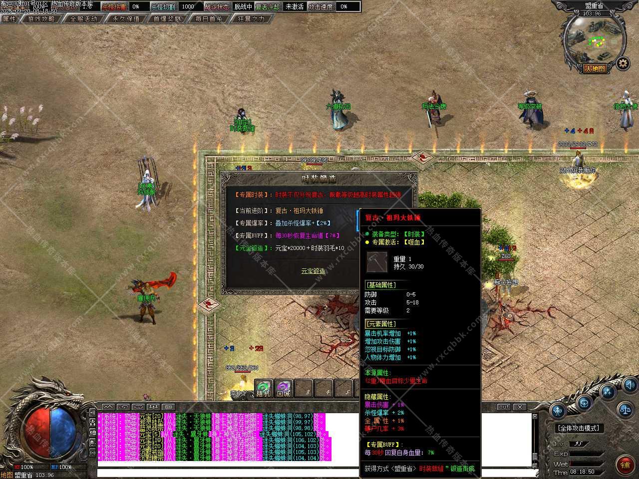 六、新增装备祭炼功能,需要一定的祭炼值,如果没有可以用5通宝=1祭炼值比例在NPC那兑换,祭炼值(100/10000)除以100即为[1%]伤害值,最高伤害值100%封顶,超神万古的力量于寂灭中重生,在PK中绝对的压制敌人(对怪无效)。
