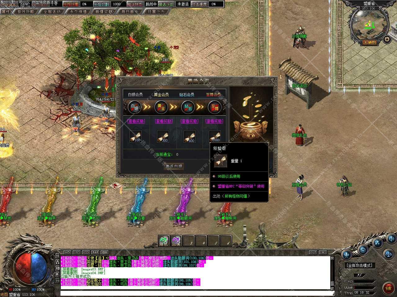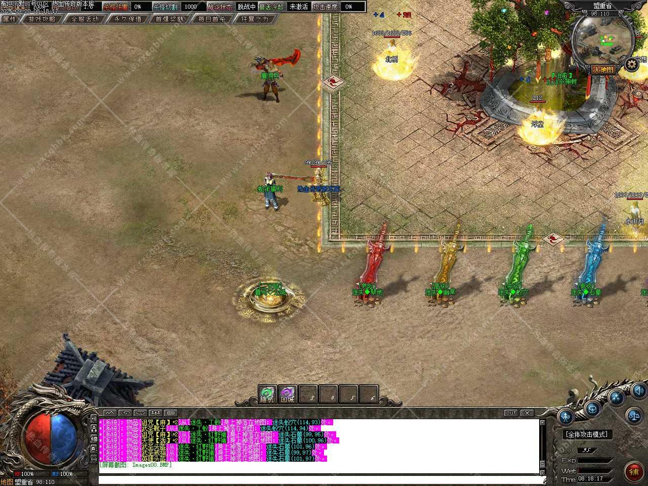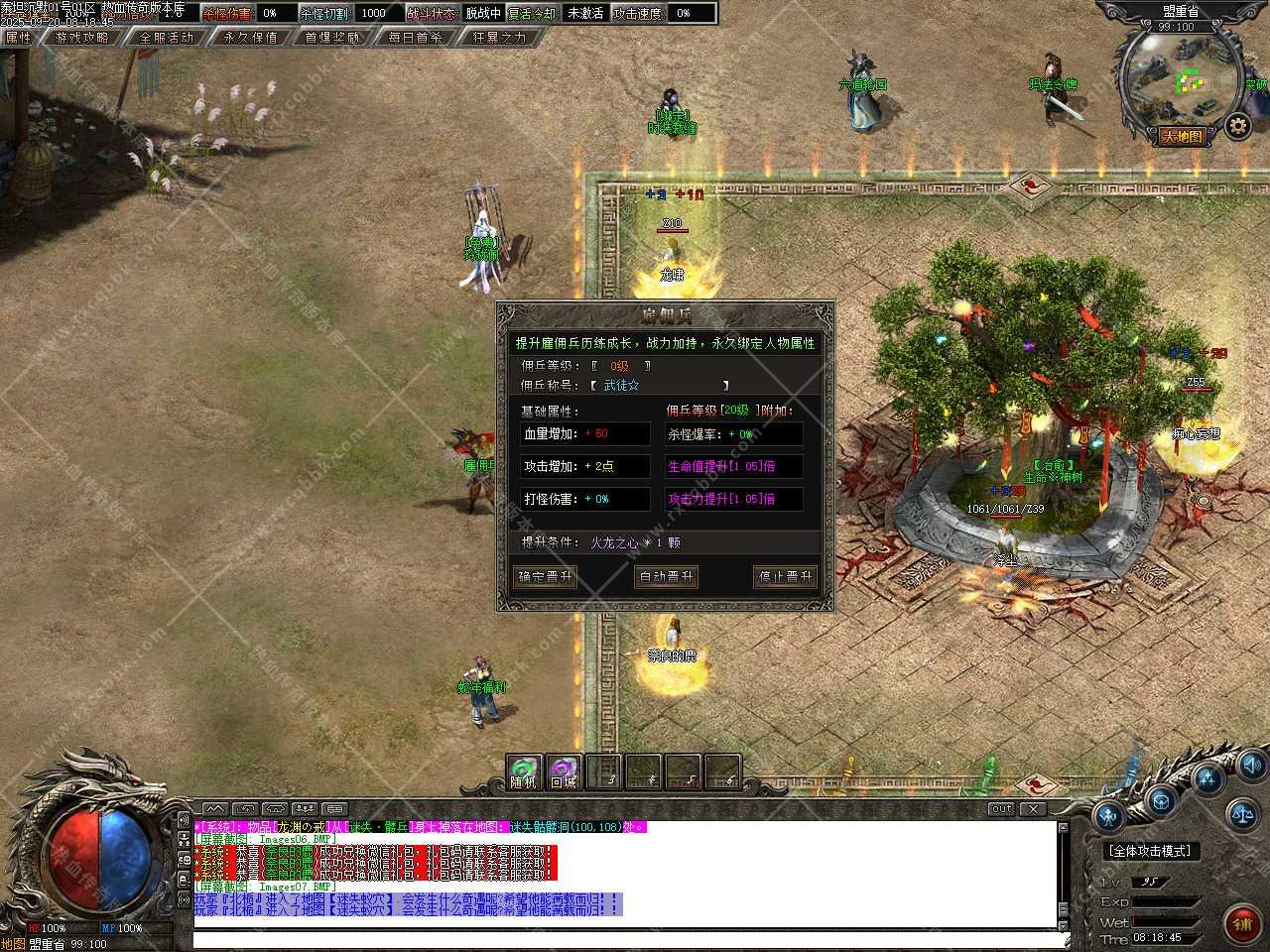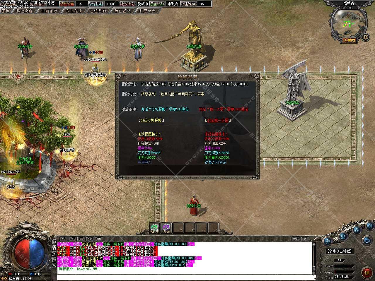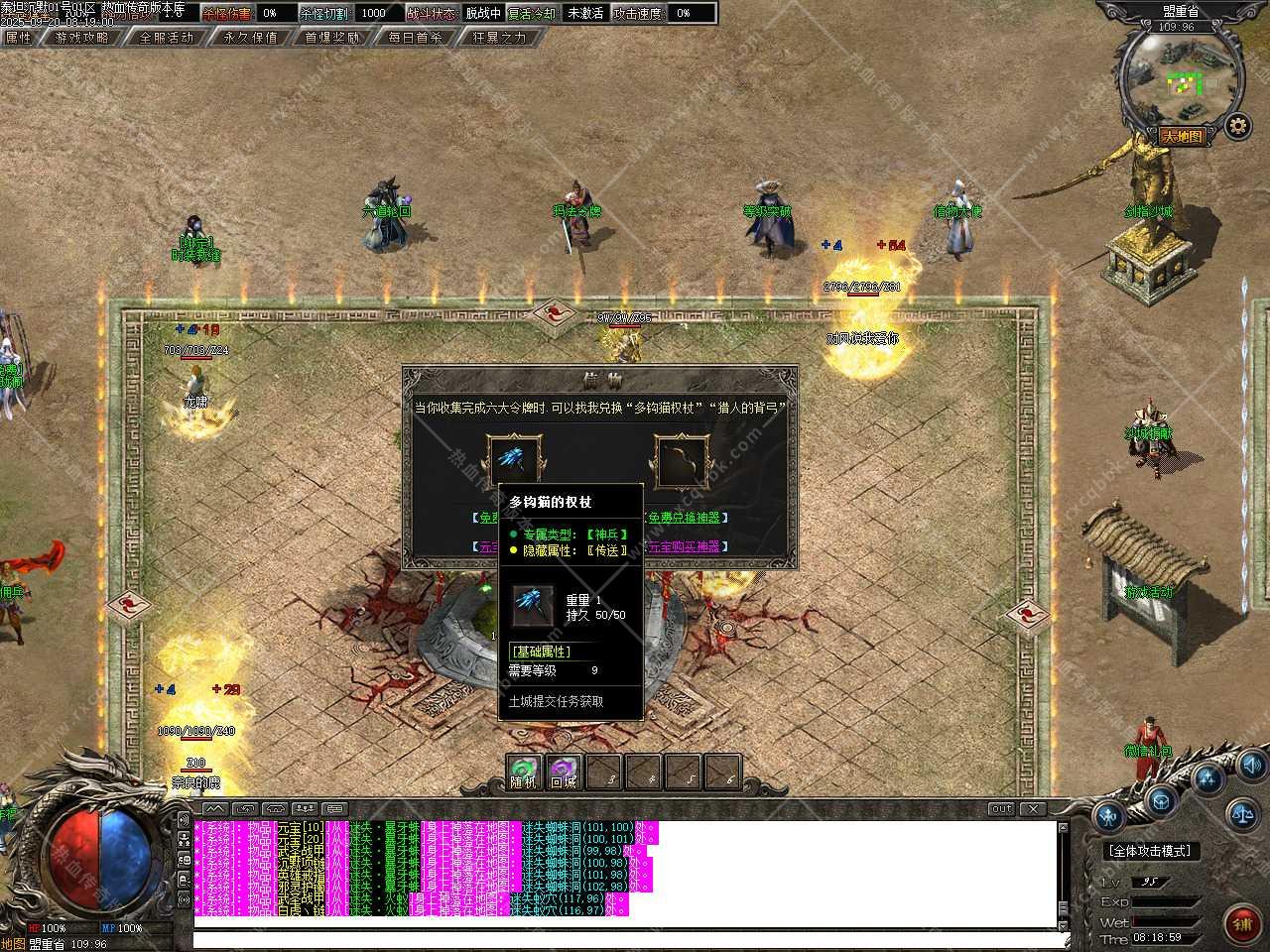 六、新增装备祭炼功能,需要一定的祭炼值,如果没有可以用5通宝=1祭炼值比例在NPC那兑换,祭炼值(100/10000)除以100即为[1%]伤害值,最高伤害值100%封顶,超神万古的力量于寂灭中重生,在PK中绝对的压制敌人(对怪无效)。